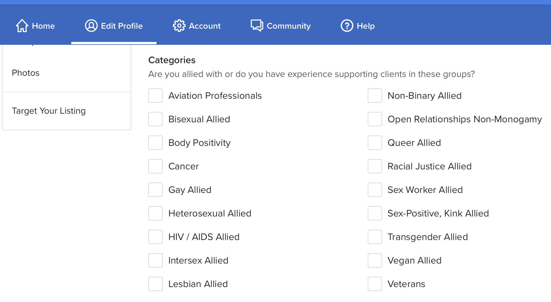 While it is definitely a step in the right direction and has been a long time coming, these new categories can not be searched by people that are trying to filter through therapists on the Psychology Today directory. For example, if you are searching for a therapist who is “Transgender Allied,” you’ll need to click through each therapist profile and scroll down to see if they have selected this category. It’s not as easy or intuitive compared to a site like TherapyDen. When you search and filter for a therapist at therapyden.com, you can select “Trans/Non-binary” as well as “Open Relationships/Non-Monogomy” and it will display all the therapists in your area that are trans/non-binary and specialize in treating open relationships and non-monogamy issues.