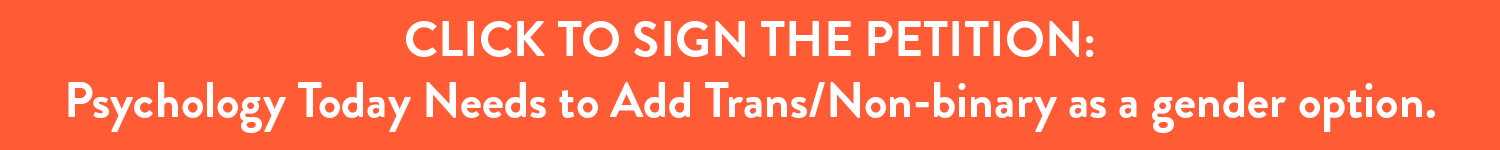 In order to get the attention of Psychology Today, and hopefully motivate them to create a third gender option as a search filter, we have created a petition that everyone can sign. Whether you’re in the mental health field or not, we want you to sign the petition. It will only take a minute and could go a long way to making a real difference.