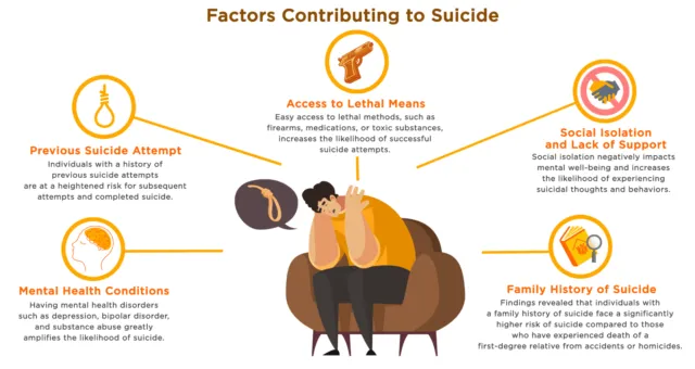 Factors contributing to suicide encompass various aspects and can differ among individuals. Understanding these factors is crucial for effective prevention efforts. Here is a comprehensive overview of key contributors to suicide: