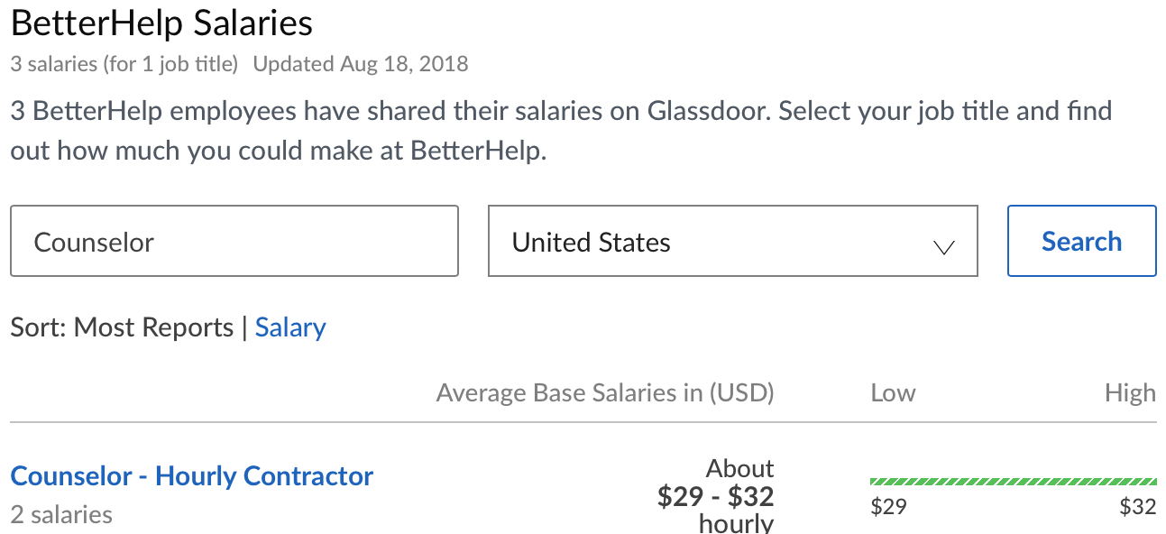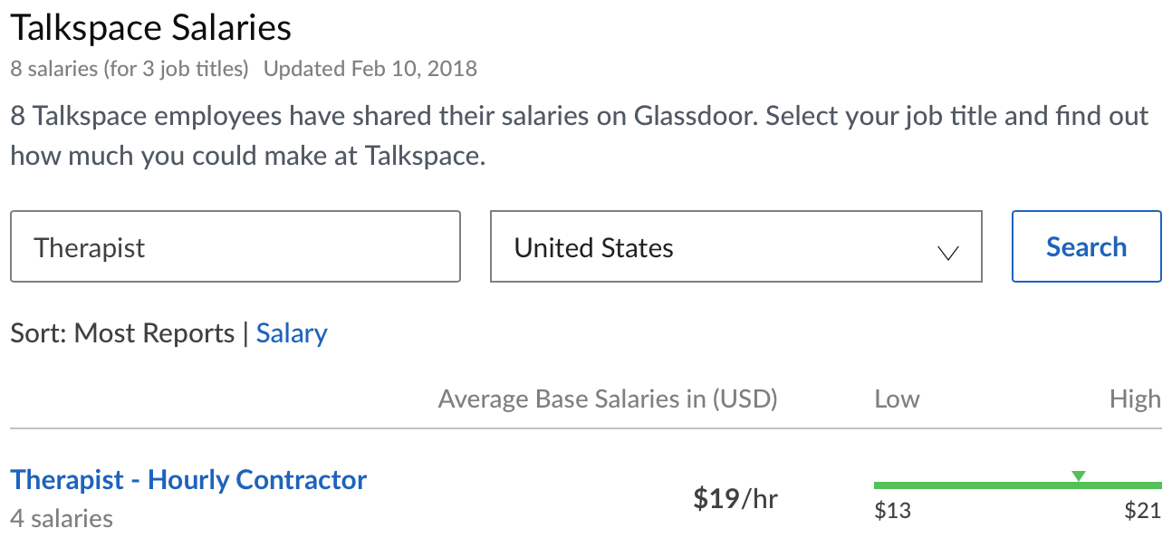 Even though I don’t ask Alyssa about her hourly wage, I have talked to many therapists who work for these online therapy platforms and they all report similar pay. I also visited glassdoor.com to confirm the data I have collected from therapists and it matches up perfectly.