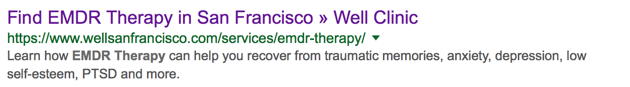 Keywords and Google search terms were clearly identified when the website was created. I imagine the creator of the website started with a list of terms they wanted to rank for and then created a website around that. One peek at their EMDR page proves this theory. The term "EMDR" can be found in the heading and sub headings of all the content. They plainly define what EMDR is and how it can be used in therapy. They answer a few frequently asked questions, and they also have a video about EMDR. Every therapist should use this exact structure when creating pages about the issues they focus on and the treatments they use in counseling. Good job Well Clinic!