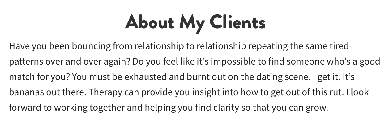 First of all, if you have a Psychology Today or GoodTherapy profile, then you don’t even have an About My Clients section and I feel bad for you. But I feel even worse for potential clients that are trying to picture themselves in your office. This section is the most important written section on your profile. So take it seriously and try your very best to connect with your ideal clients. Mine is so damn good because I continue the trend of my Intro section and speak directly to my ideal clients. Throughout your profile, it’s important that you connect with the populations and issues that you best serve. I want to treat clients that keep tripping up on the same relationship patterns they’ve experienced all their lives. And that’s exactly what I’m going to put in this section.
