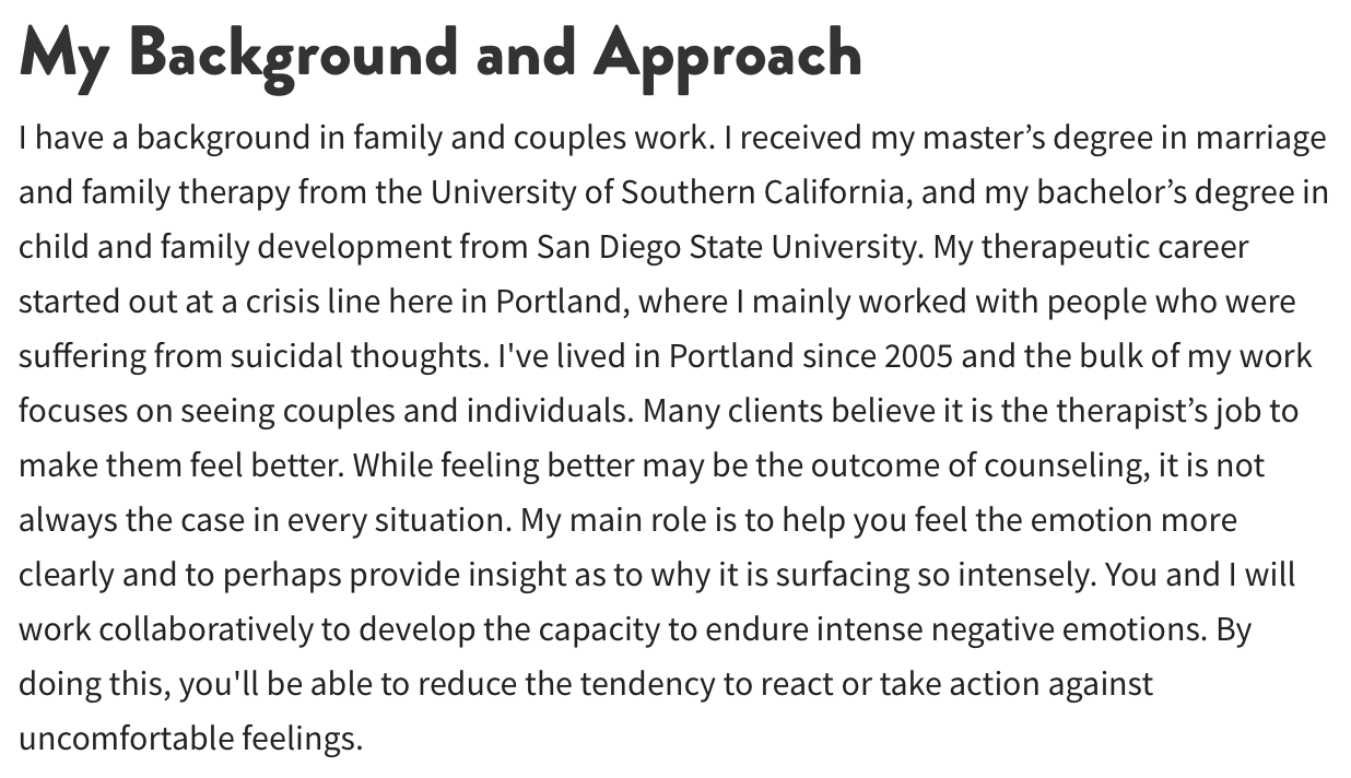 While I do spend a few sentences proving to the reader that I went to school for counseling and that I have been a practicing therapist in their wonderful city since 2005, I also clarify what counseling actually is so that I can do a bit of expectation setting before they even step into my office. I use the magical word “collaborative,” which for whatever reason, really resonates with clients and get’s them to reach out more often to therapists that use that word compared to therapists that don’t.