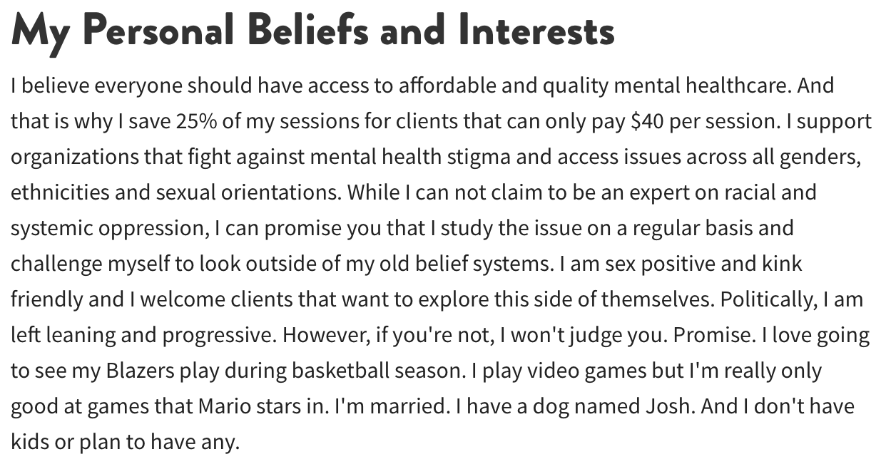 When I wrote this section, I checked in with how much I would feel comfortable revealing and you should do the same. Whether we like it or not, clients are trying to find a therapist that matches their values. If there is a value match, then there is a better chance they’ll reach out. Can a client and therapist experience success even if values are mismatched? Of course they can. I have helped plenty of folks who have different values or beliefs than I do. However, more clients today are first looking for a values and personality match. And that’s why this section is so crucial.