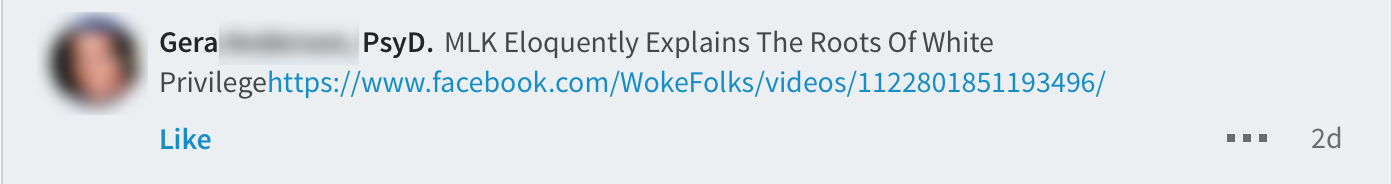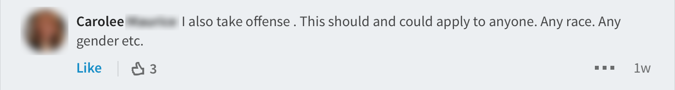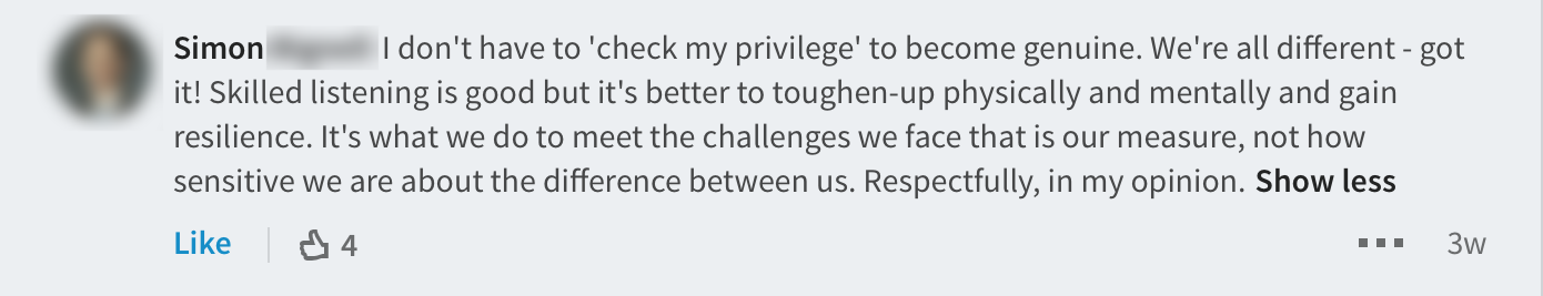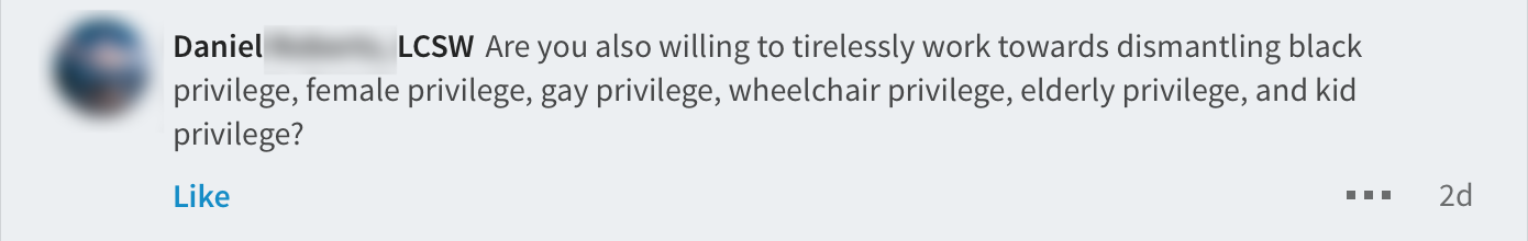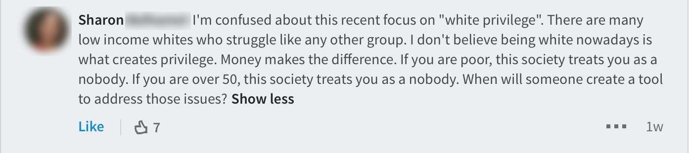Along with positive feedback, productive discussion and respectful suggestions for tweaks or improvements to the tool and the article, I got a depressing amount of negative comments. And for some reason, they all came from LinkedIn. Not sure what that says about LinkedIn. But all facebook comments were respectful. I can’t say that about LinkedIn. If you’d like to check out the public comments on LinkedIn, you can click here to read them. There are over 100 comments, many of them inspiring. Feel free to add to them if you’d like. Below, I’m sharing a few of the negative comments that are representative of many others. These are typical counter arguments to the idea of white privilege and I thought it might be useful to others to see how I respond to the points raised.