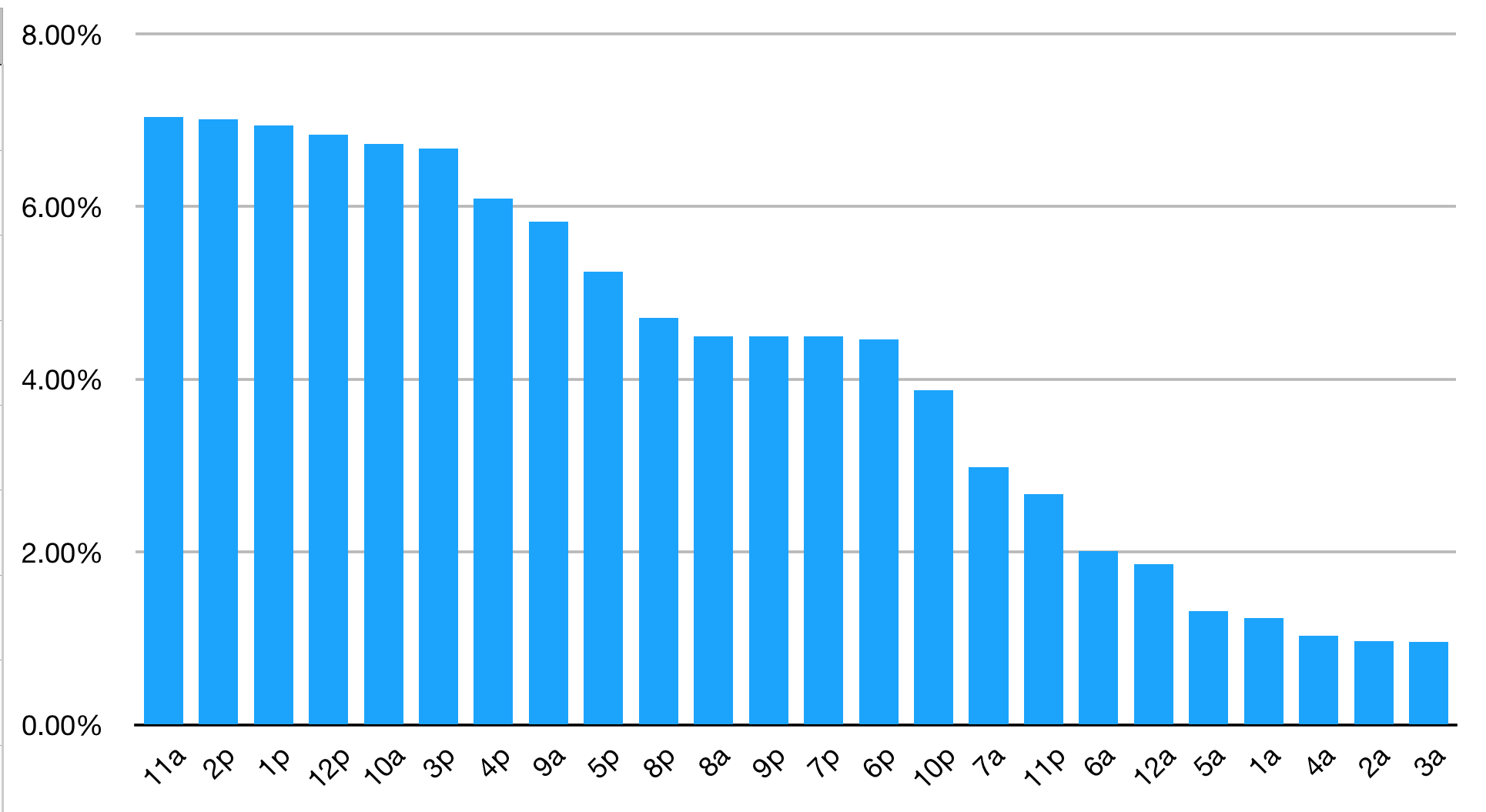As you might imagine, the two most depressing days of the week, Monday and Tuesday attract the most people looking for counseling services. Almost 18% of weekly visits come from each of those days. The weekend only brings half the amount of people looking for mental health services. The graphs above shows a steady decline in visitors as we approach the weekend.