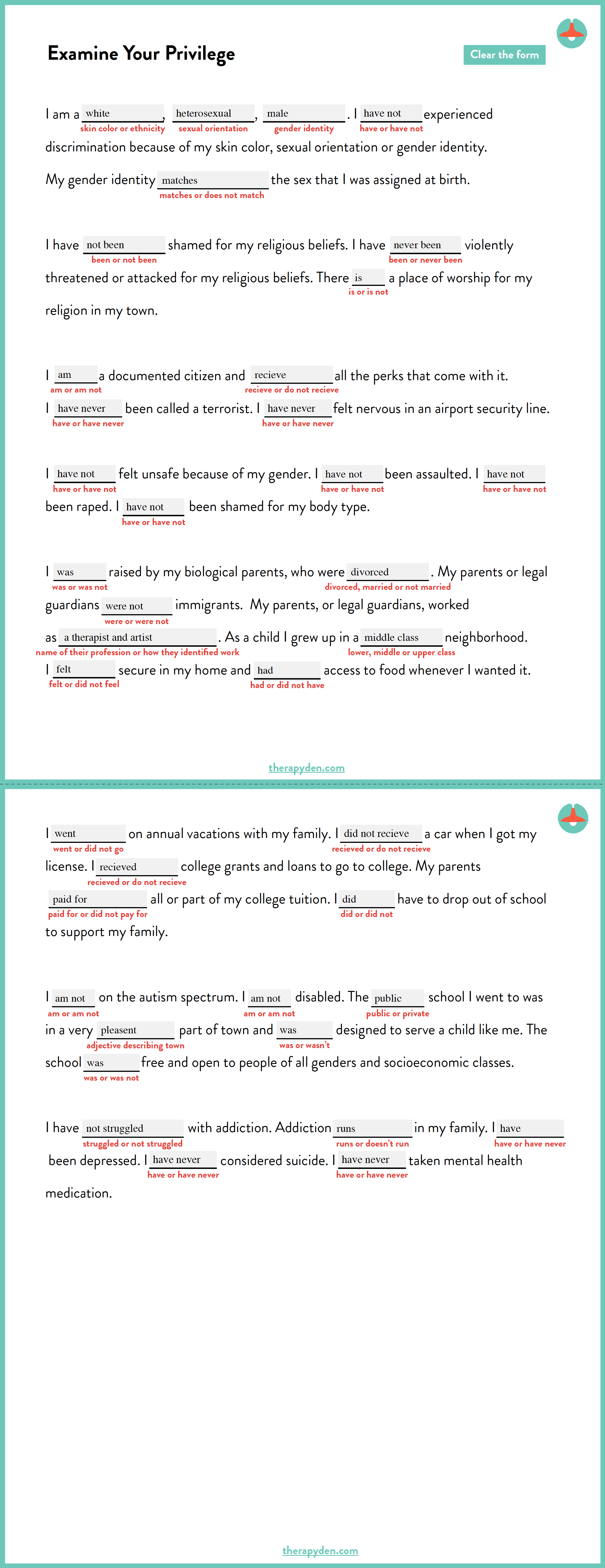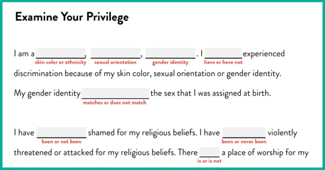 After learning everything I can about privilege (and acknowledging that there is always more we can learn), I have developed a therapeutic tool to examine my own privilege, while also taking into consideration my client’s individual circumstances. It’s a simple fill-in-the-blank form that I’m sharing to help other practitioners improve their awareness of privilege. It works for you and/or your clients. Maybe you can fill it out together. It’s a great way to get important background and context on your client and keeping the potential differences between the two of you in mind will make you a better therapist for that client. You can view and download it by clicking here. It’s free. Save it on to your computer and start using it!